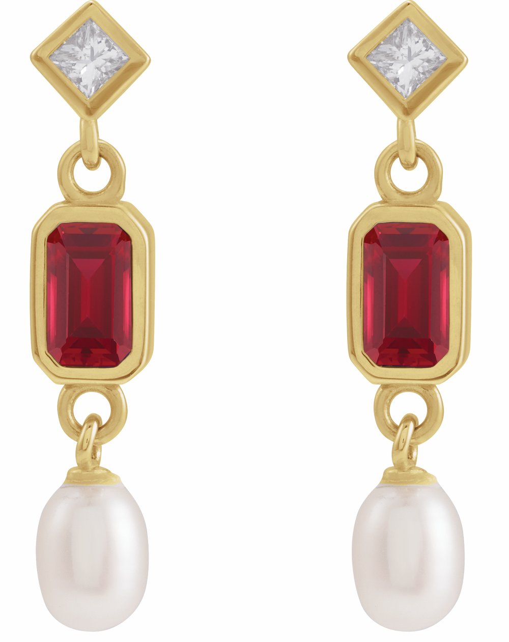 Description: Lab-Grown Ruby And .05 Ctw Natural Diamond And Cultured Pearl Dangle Earrings