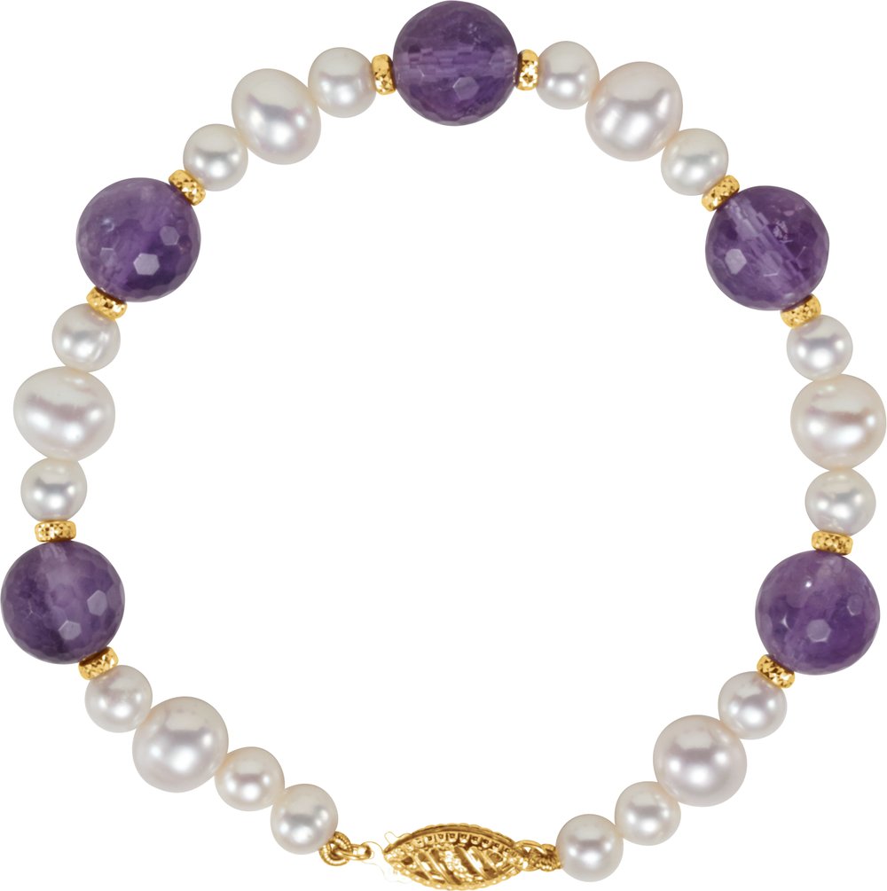 14K Yellow Gold Natural Amethyst & Cultured White Freshwater Pearl 7 1/2" Bracelet